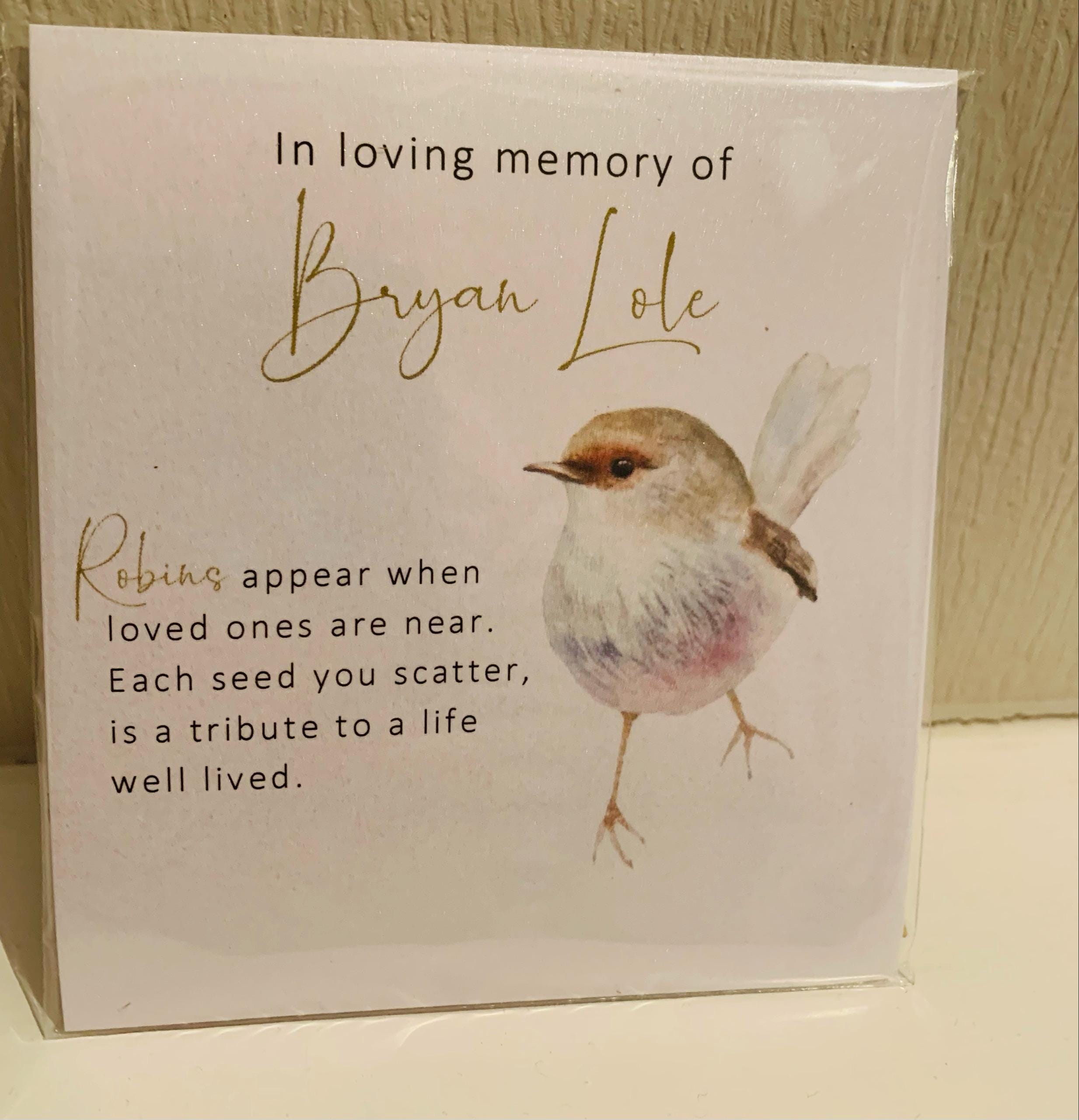Each personalised card will be supplied with bird seed sealed neatly inside a cello bag.