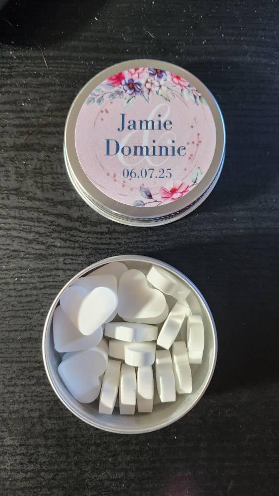 Each lovely little tin is supplied empty or filled with your choice of sweets — Mint Hearts, Chocolate Dragees, Jelly Bean Hearts, Jelly Beans, Jelly Babies, Dew Drops, Smarties, Chocolate Eggs or Love Hearts — and topped off with a personalised sticker.