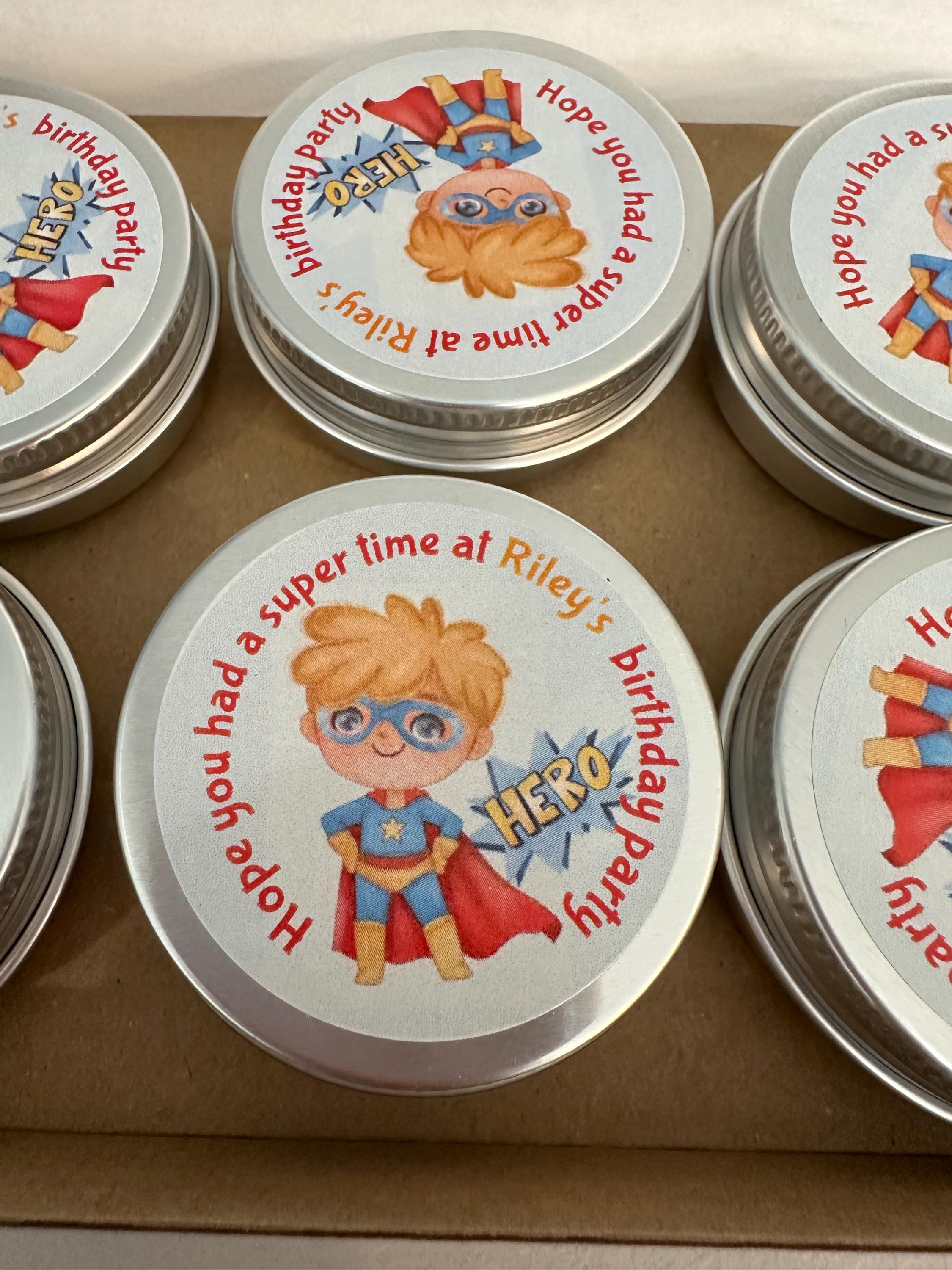 Each little tin is supplied complete with a choice of sweeties and topped off with a personalised superhero sticker.