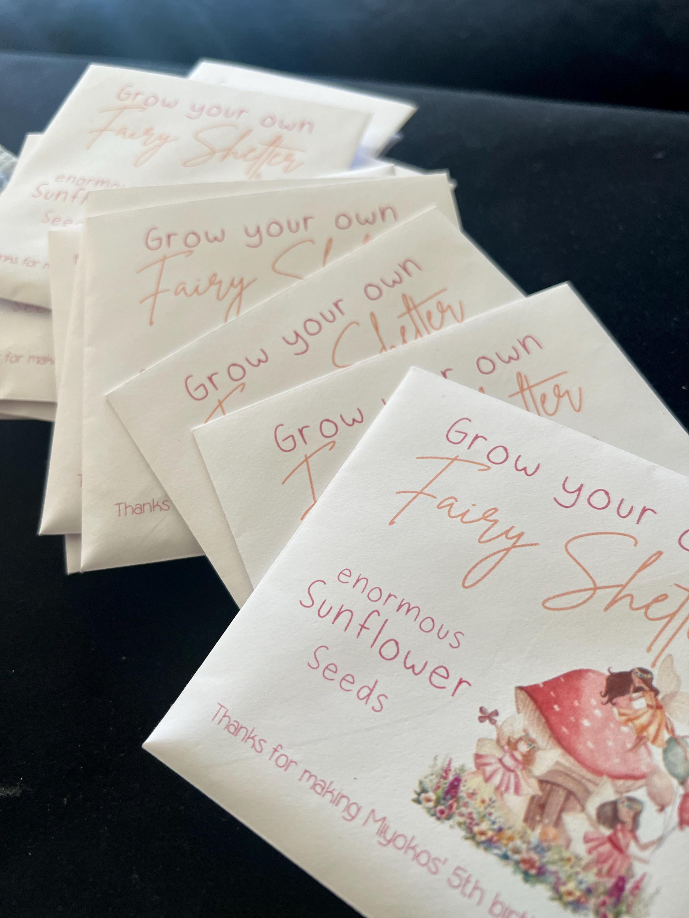 Each personalised Magical Fairy Dust envelope is supplied with wildflower seeds. Alternatively you can choose Sunflower seeds inside envelopes with the slogan Grow Your Own Fairy Shelter.