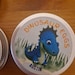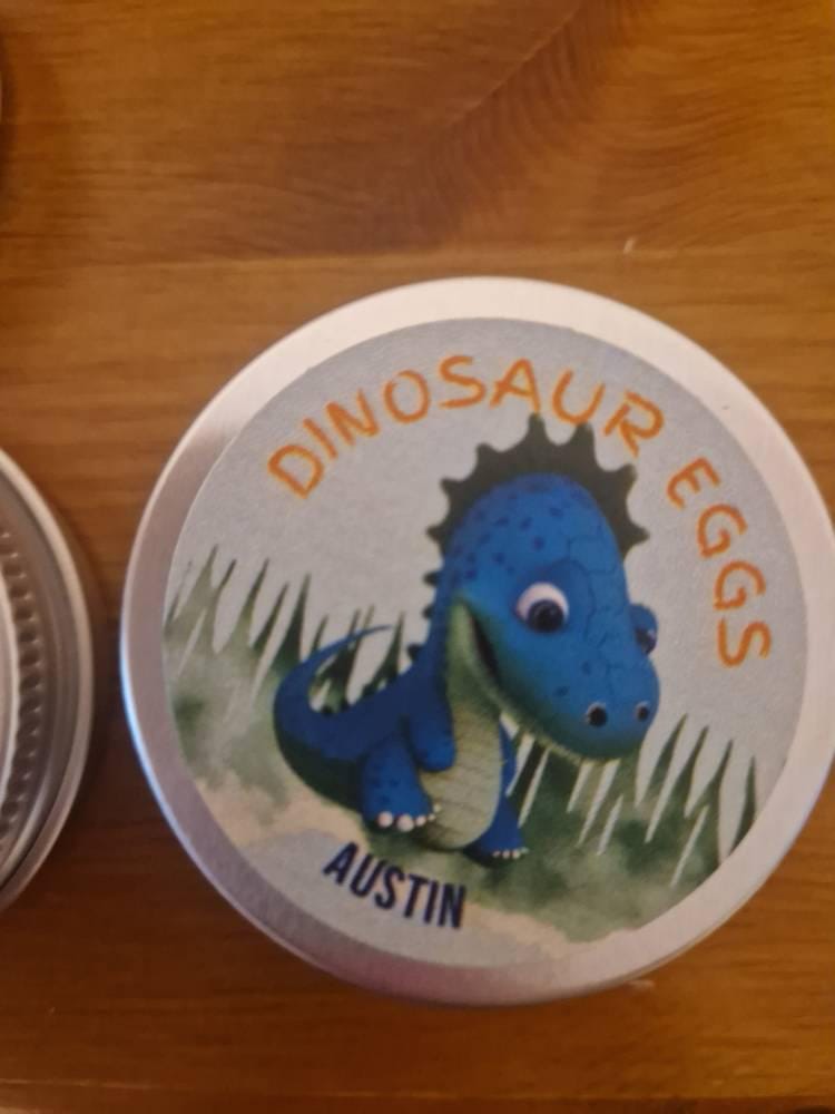 Each little tin is supplied complete mini chocolate eggs and topped off with a personalised dinosaur sticker.