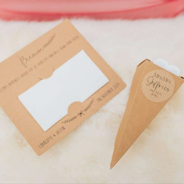 These fun personalised wedding tissue holders measure 140mm wide and 125mm high and are available in a choice of five colours as shown.